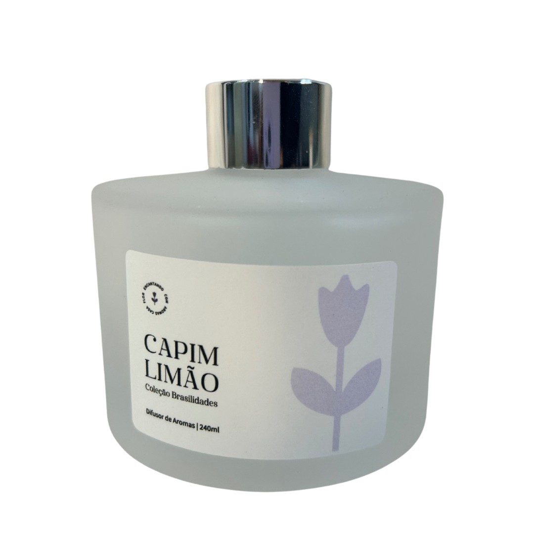 Apresentamos o Difusor de Aromas Capim Limão da Casa Flor, uma escolha refrescante para perfumar seu espaço. Este difusor vem em um frasco de 240 ml de vidro redondo branco fosco, complementado por uma elegante tampa prateada.